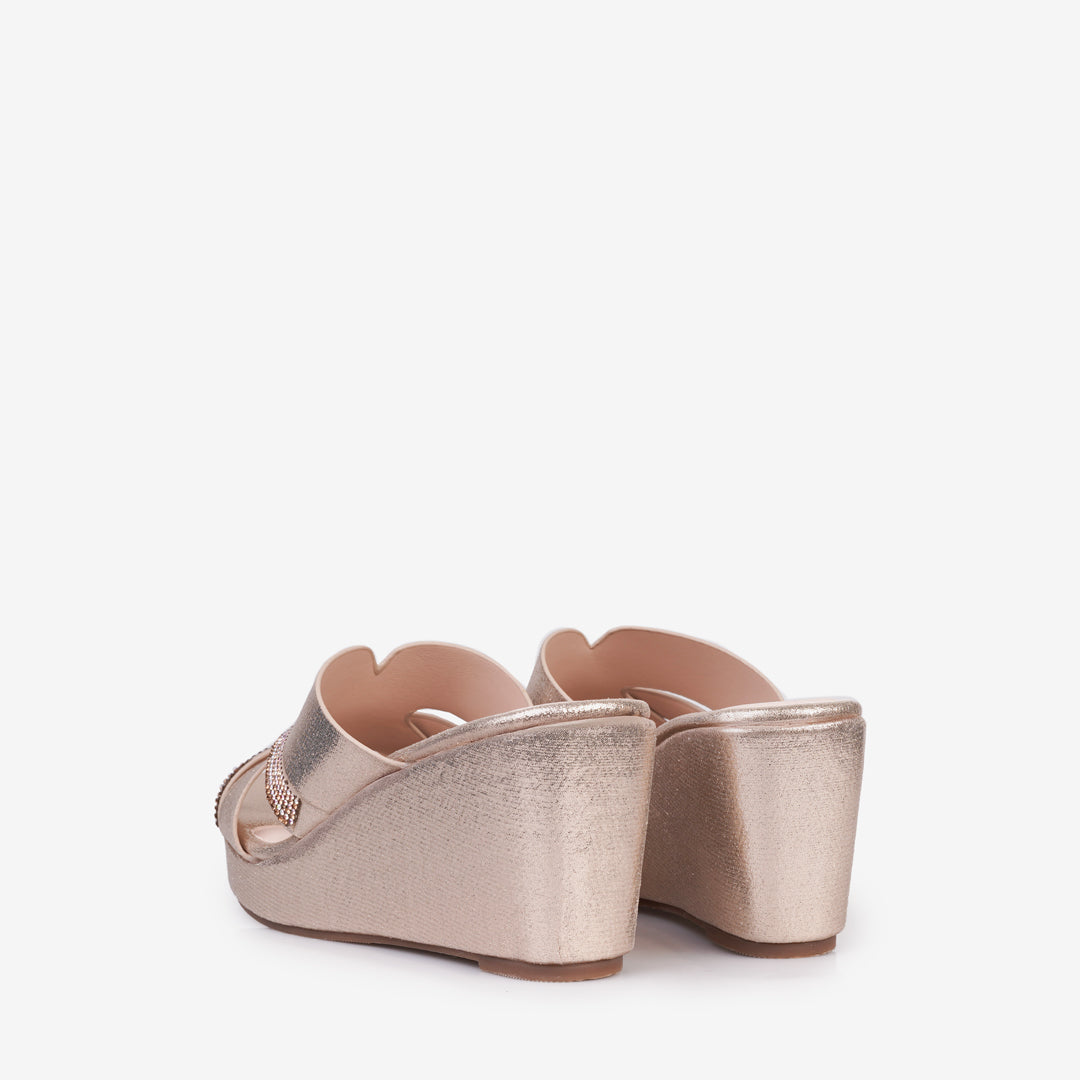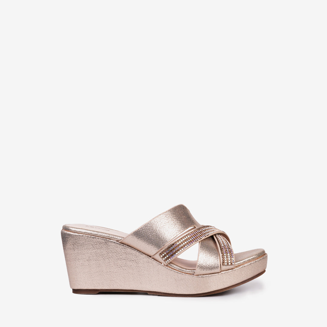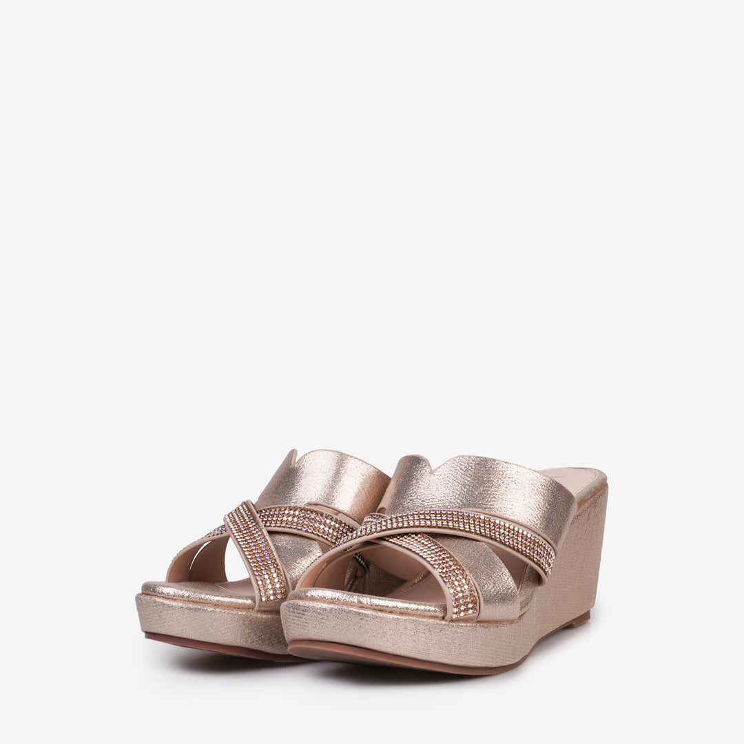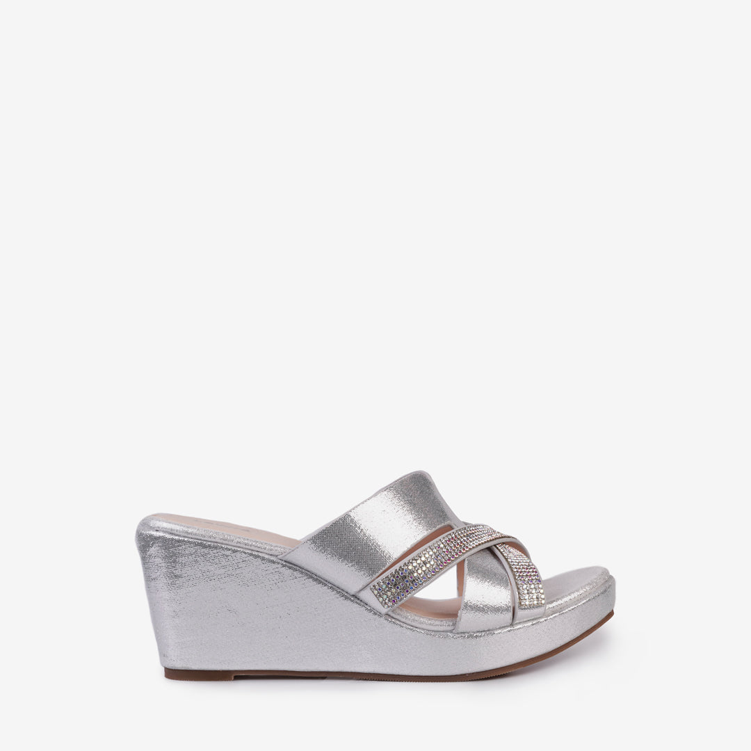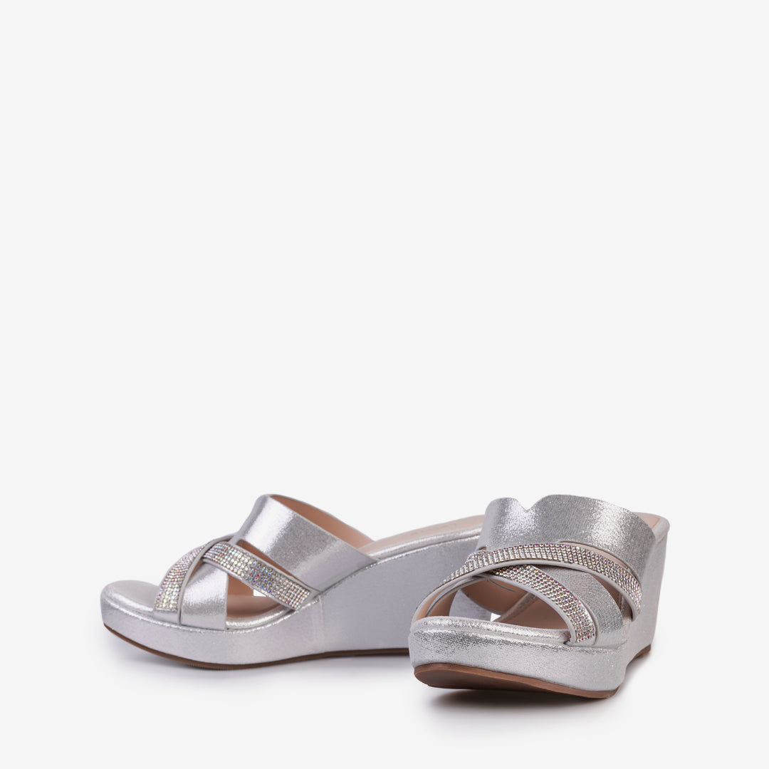 Step out in sparkling style with the Lewré Averie Women's Wedges. These eye-catching wedges feature a glamorous Soft Glitter Fabric and Diamond Embellished upper with chic crisscross straps, perfect for adding a dazzling touch to any outfit. Designed for comfort without compromising height, they feature a stable 3-inch heel and are constructed with a Micro Fibre insole and Non-Slip Soles for secure all-day wear. Available in versatile Gold and elegant Silver.