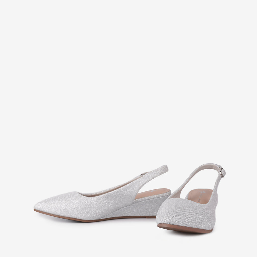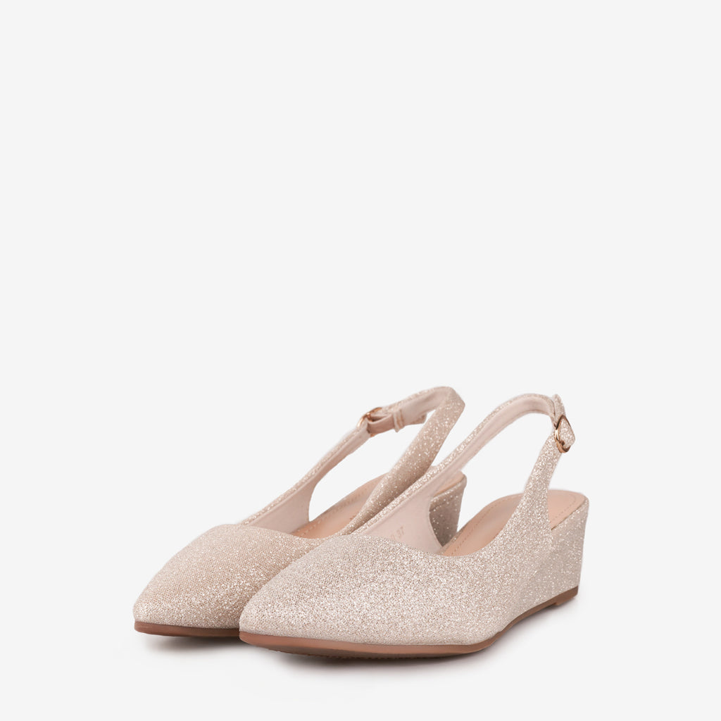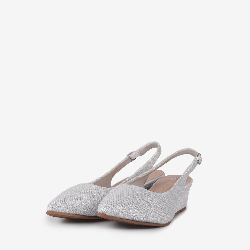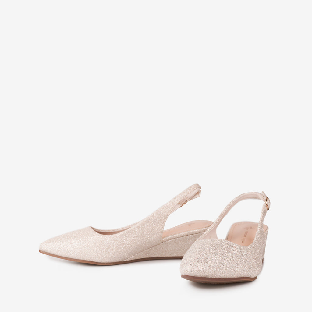Add a touch of sparkle to your ensemble with the Tricia Lew Rosalind Women's Wedges. These eye-catching shoes feature a shimmering soft glitter fabric upper, a chic pointed toe, and an adjustable slingback strap for a secure fit. The modest 1.5-inch wedge heel provides comfortable elevation, making them perfect for all-day wear or special occasions.