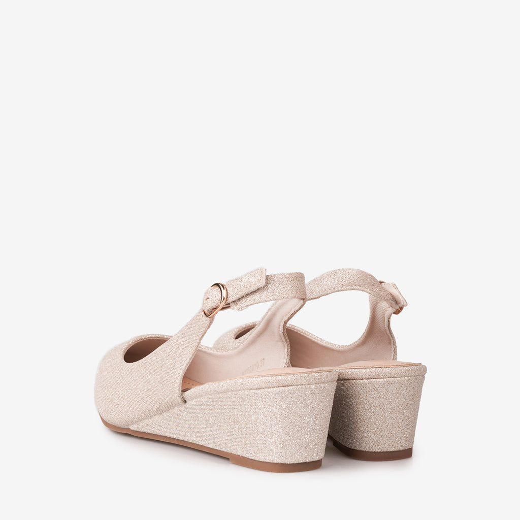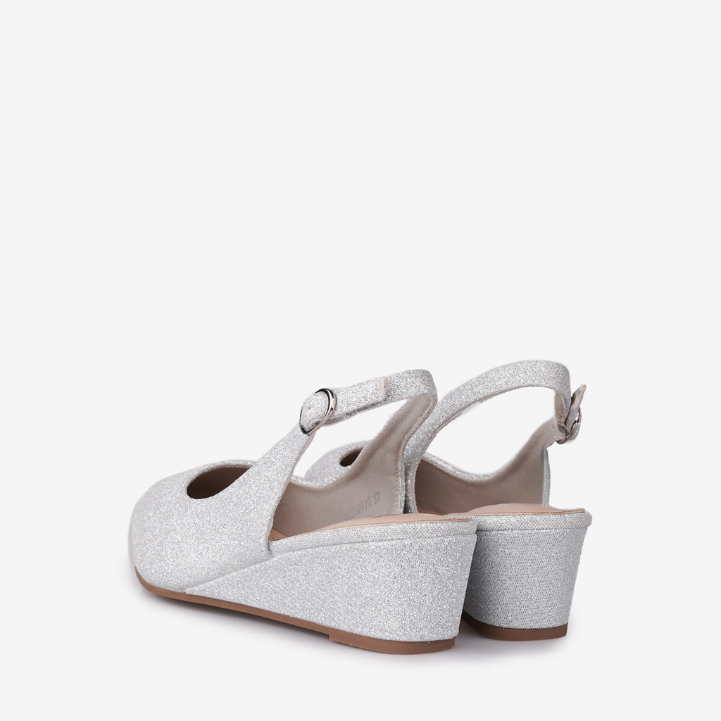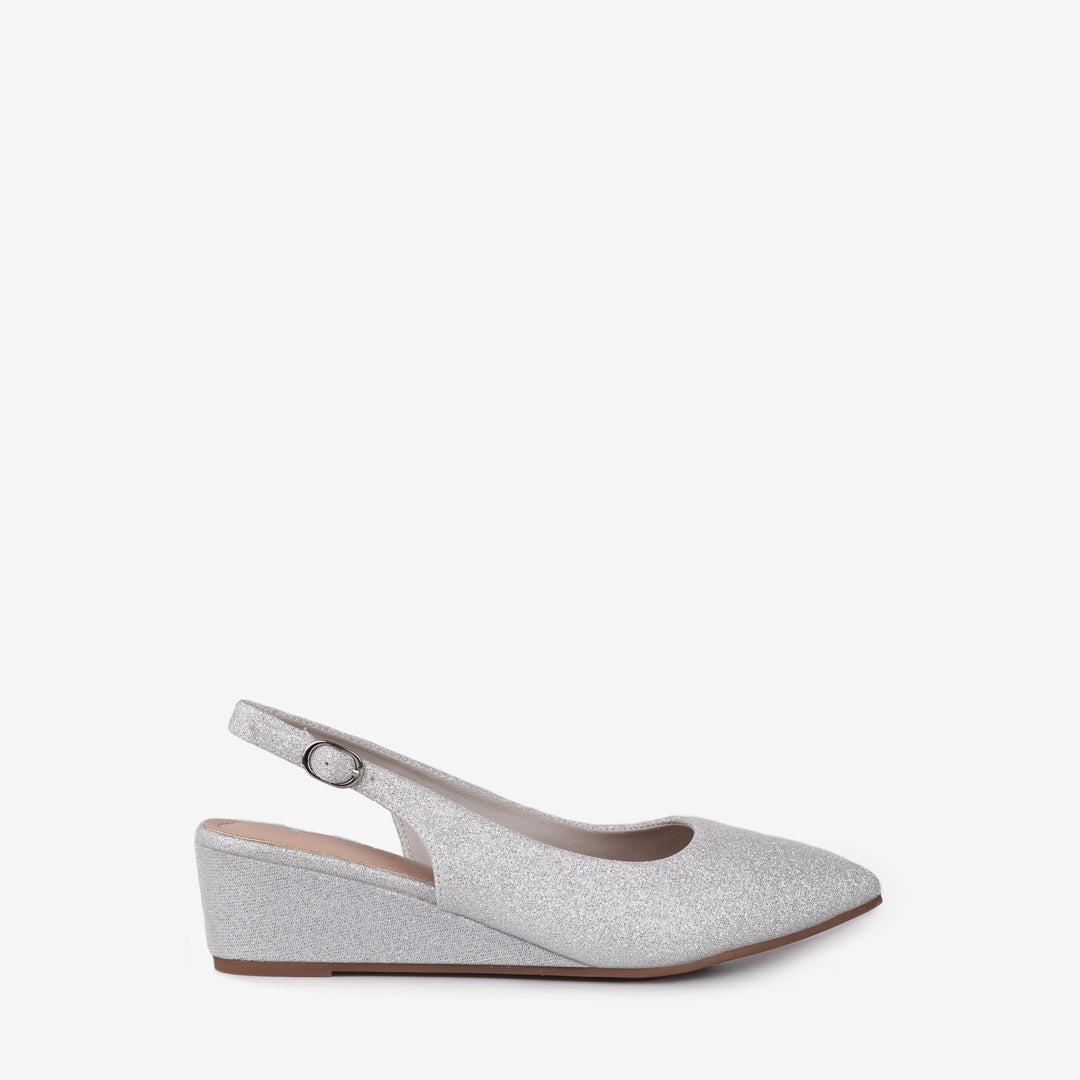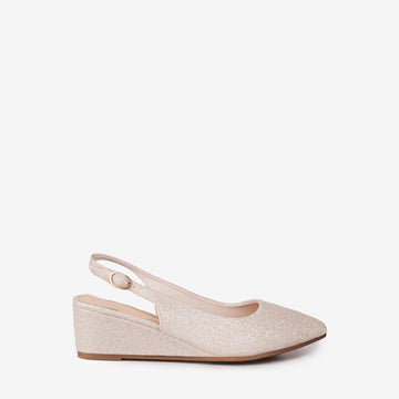 Add a touch of sparkle to your ensemble with the Tricia Lew Rosalind Women's Wedges. These eye-catching shoes feature a shimmering soft glitter fabric upper, a chic pointed toe, and an adjustable slingback strap for a secure fit. The modest 1.5-inch wedge heel provides comfortable elevation, making them perfect for all-day wear or special occasions.
