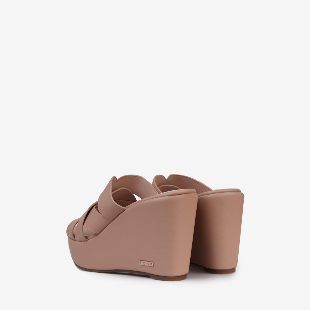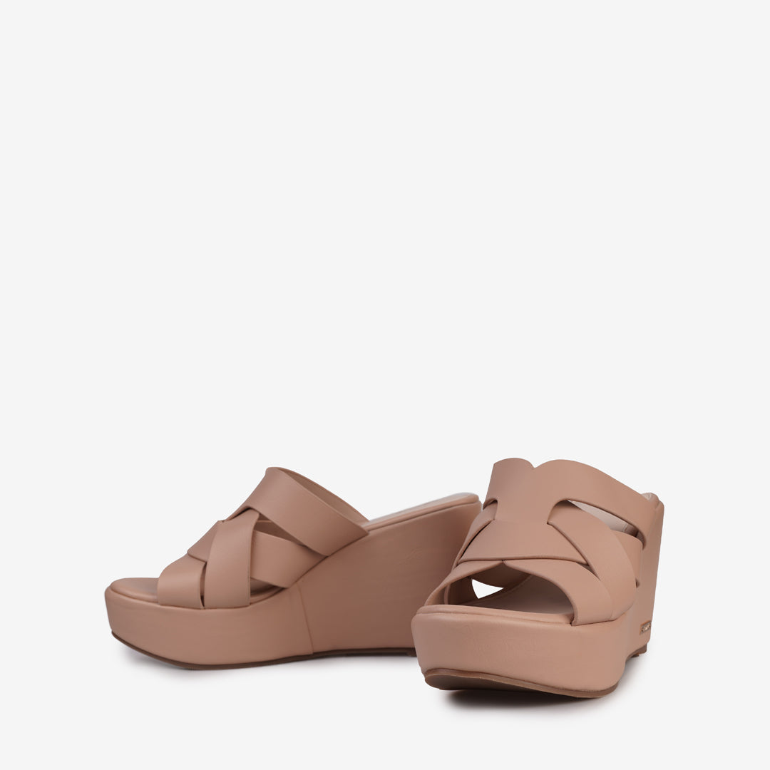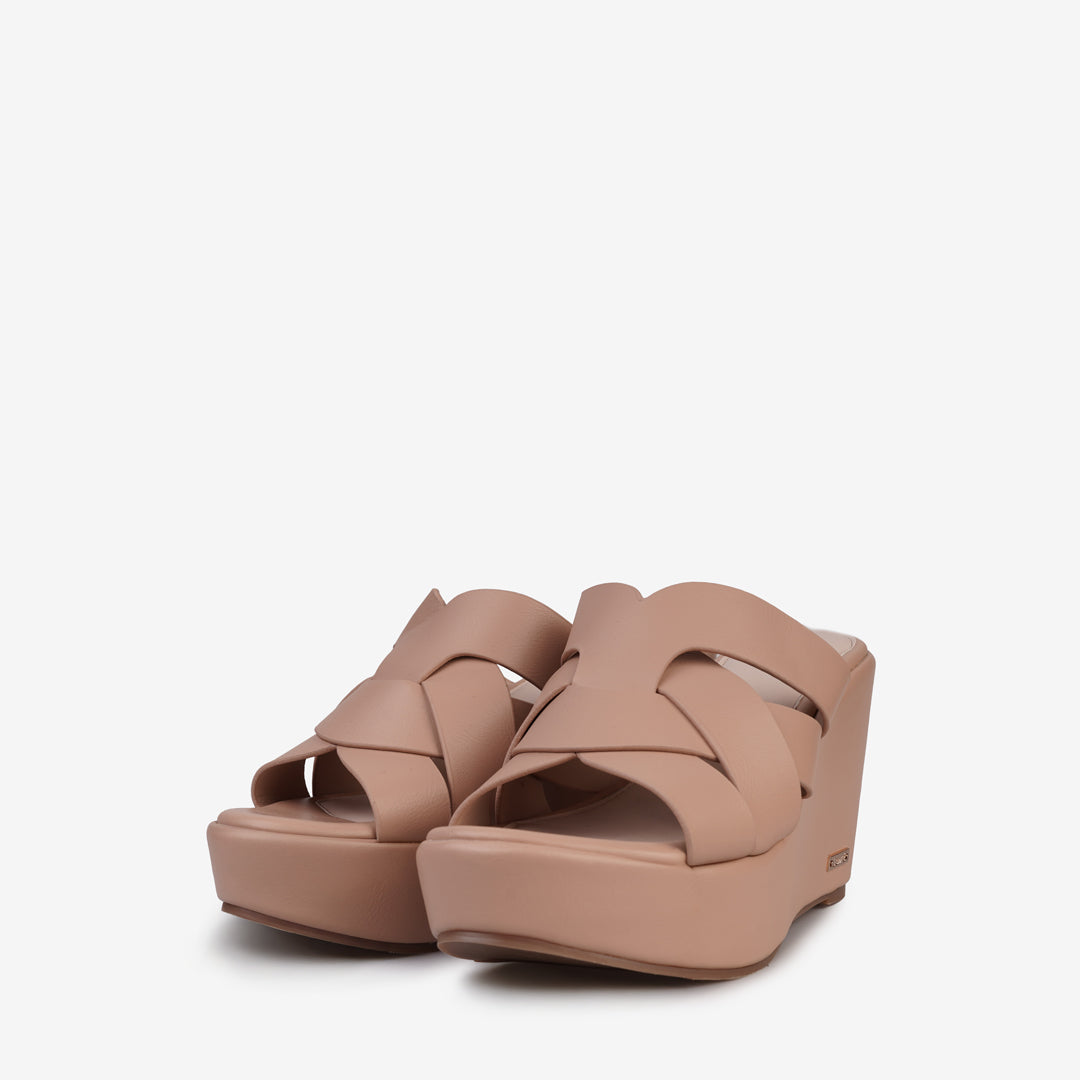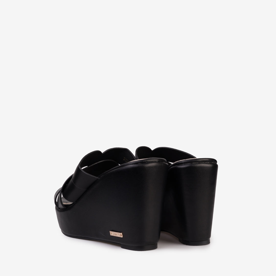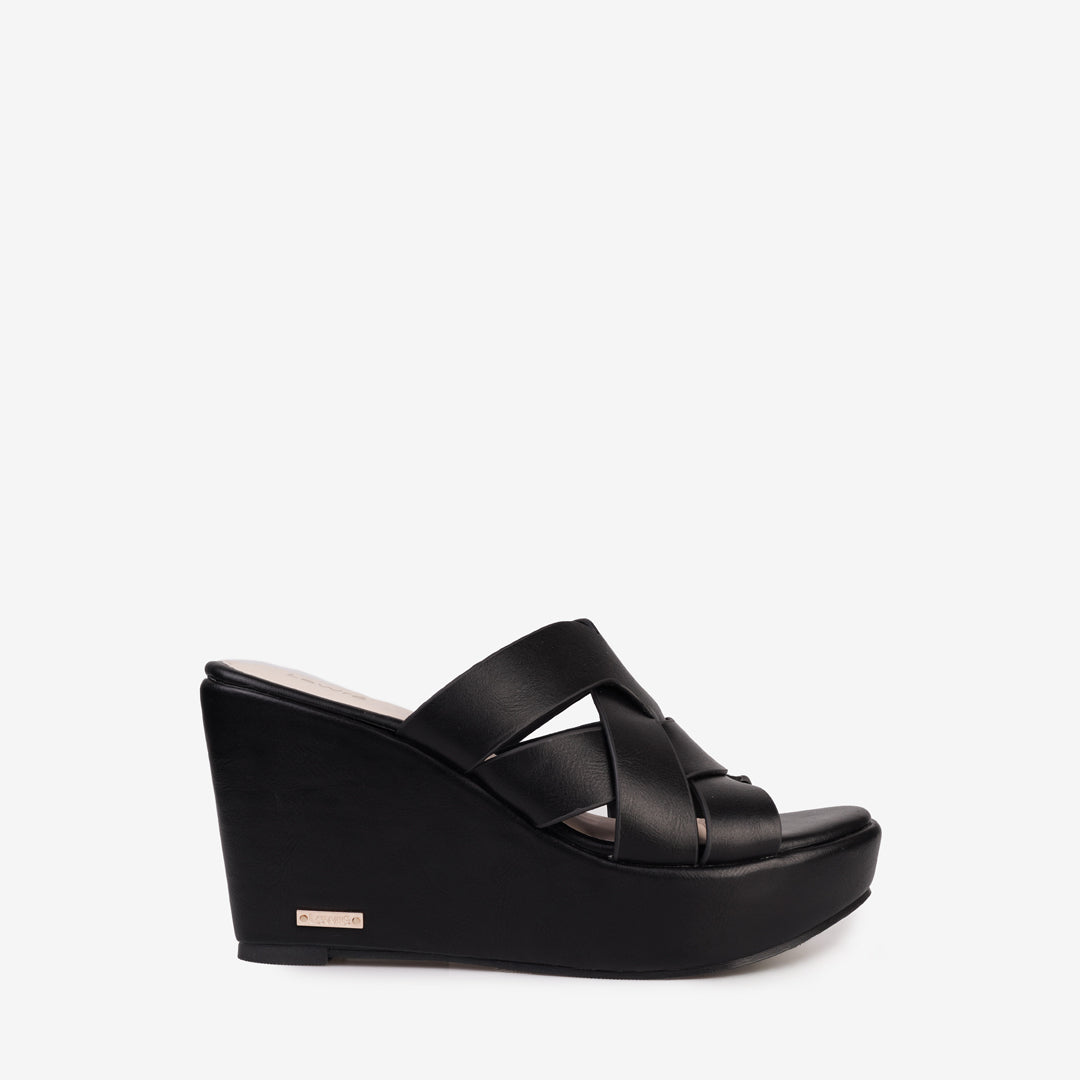 The Lewré Viane Women's Wedges are a sophisticated, high-profile mule designed to deliver maximum lift with all-day comfort. Featuring a bold Matte Polyurethane Leather upper with wide, interwoven crisscross straps, this style offers a sleek, modern look. The wedges provide a commanding 3.5-inch heel height while ensuring stability and secure footing with a Micro Fibre insole and Non-Slip Soles. Available in timeless Black and versatile Nude.