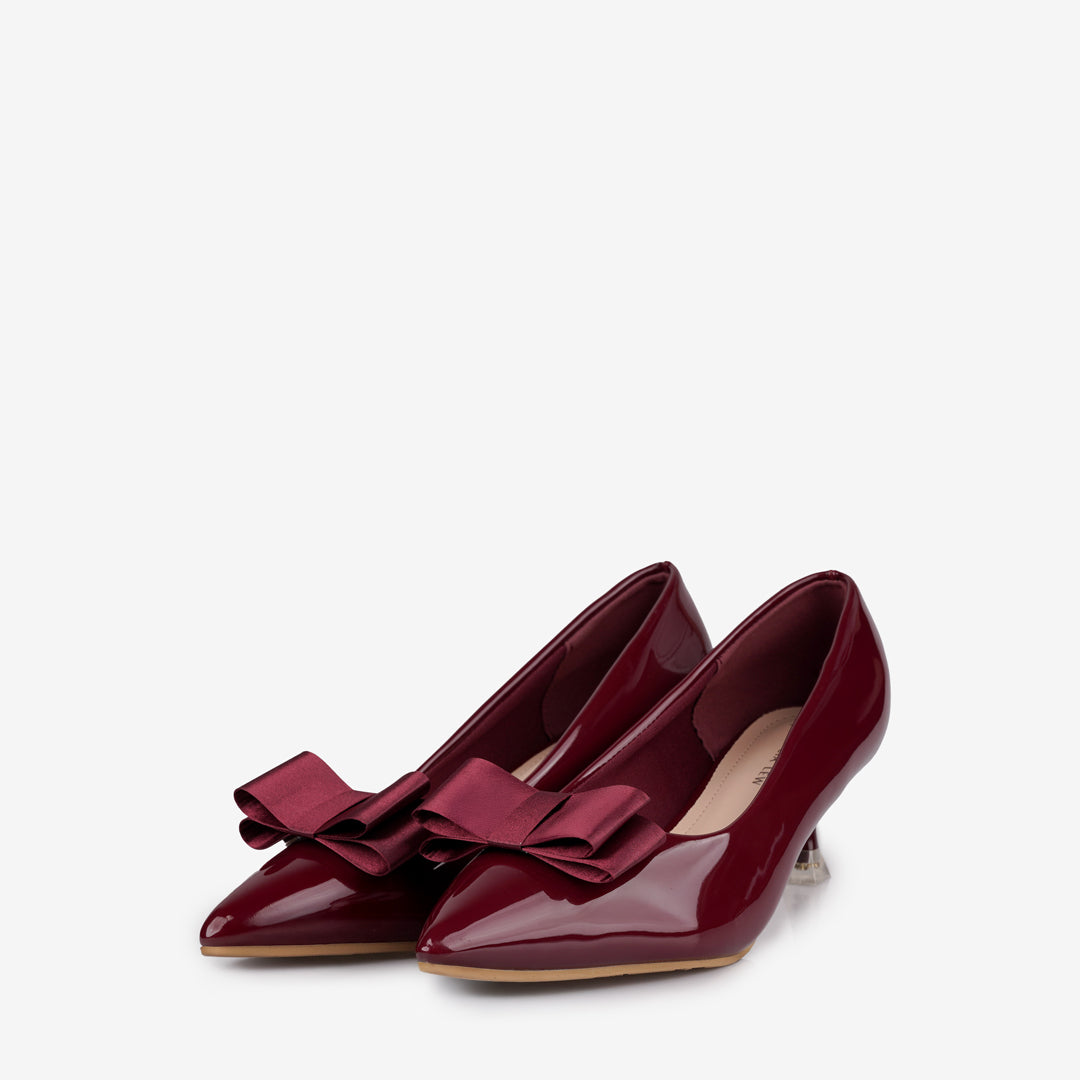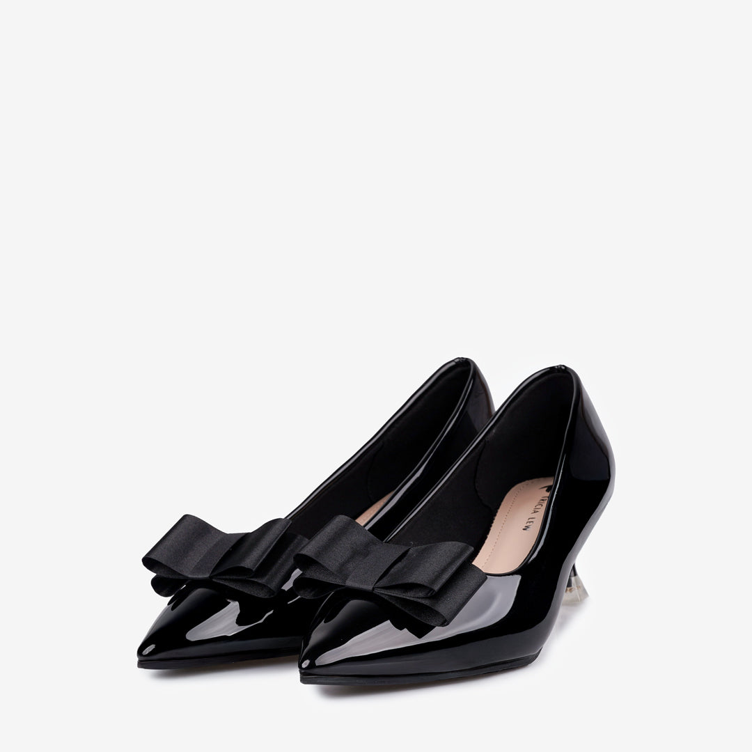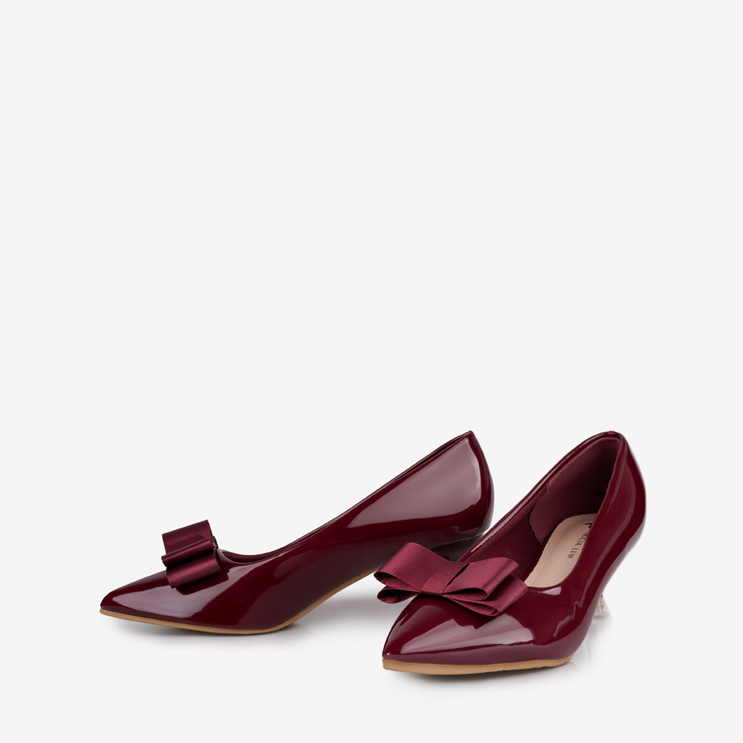 The Hedda Women's Heels by Tricia Lew are a sophisticated choice, crafted with a glossy Faux Patent Leather upper and a decorative bow accent. They feature a flattering pointed toe and a comfortable 2-inch heel. The shoes prioritize wearability with a soft Microfiber insole and a stable non-slip outsole. Available in classic Black & Wine.